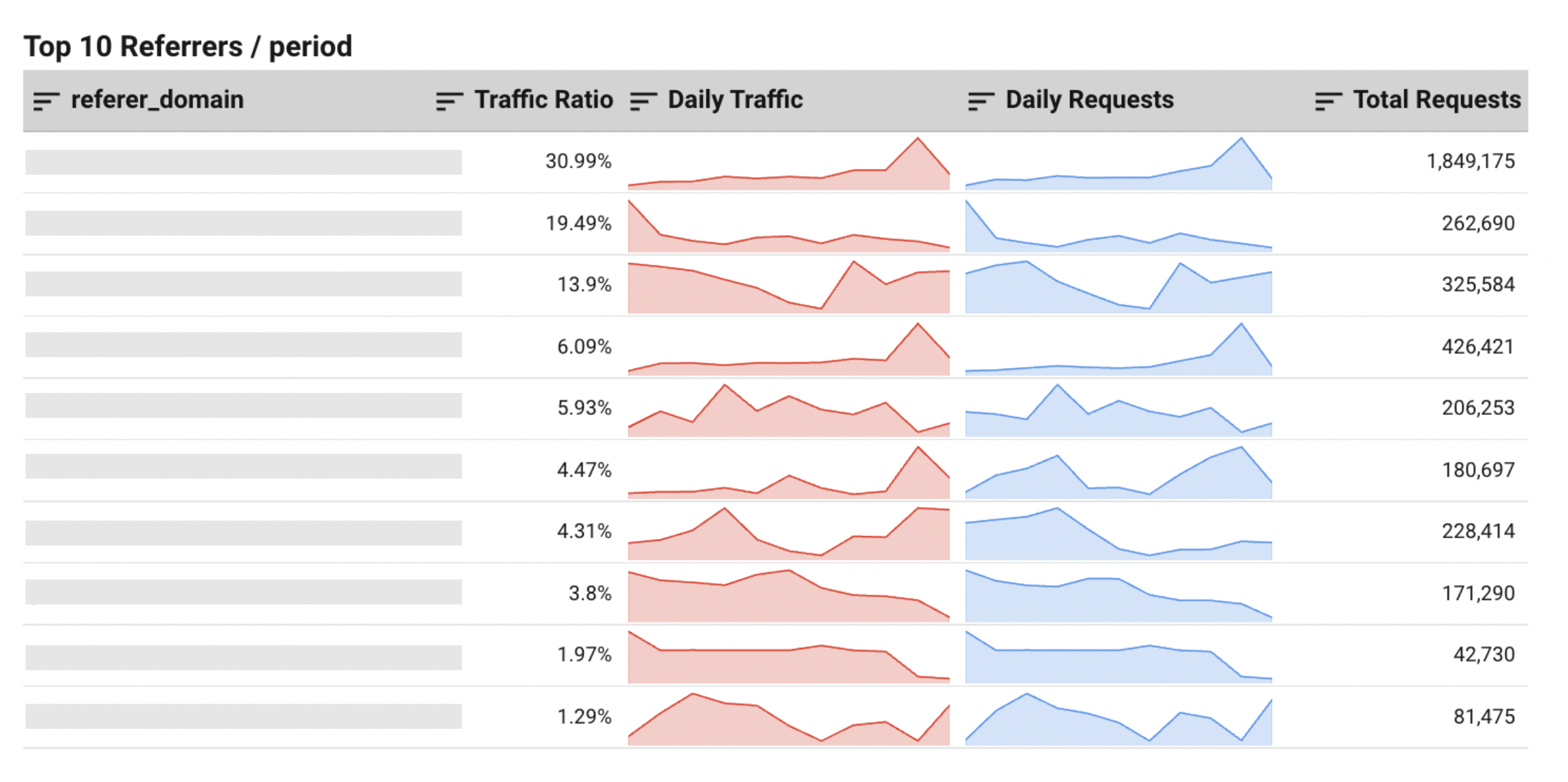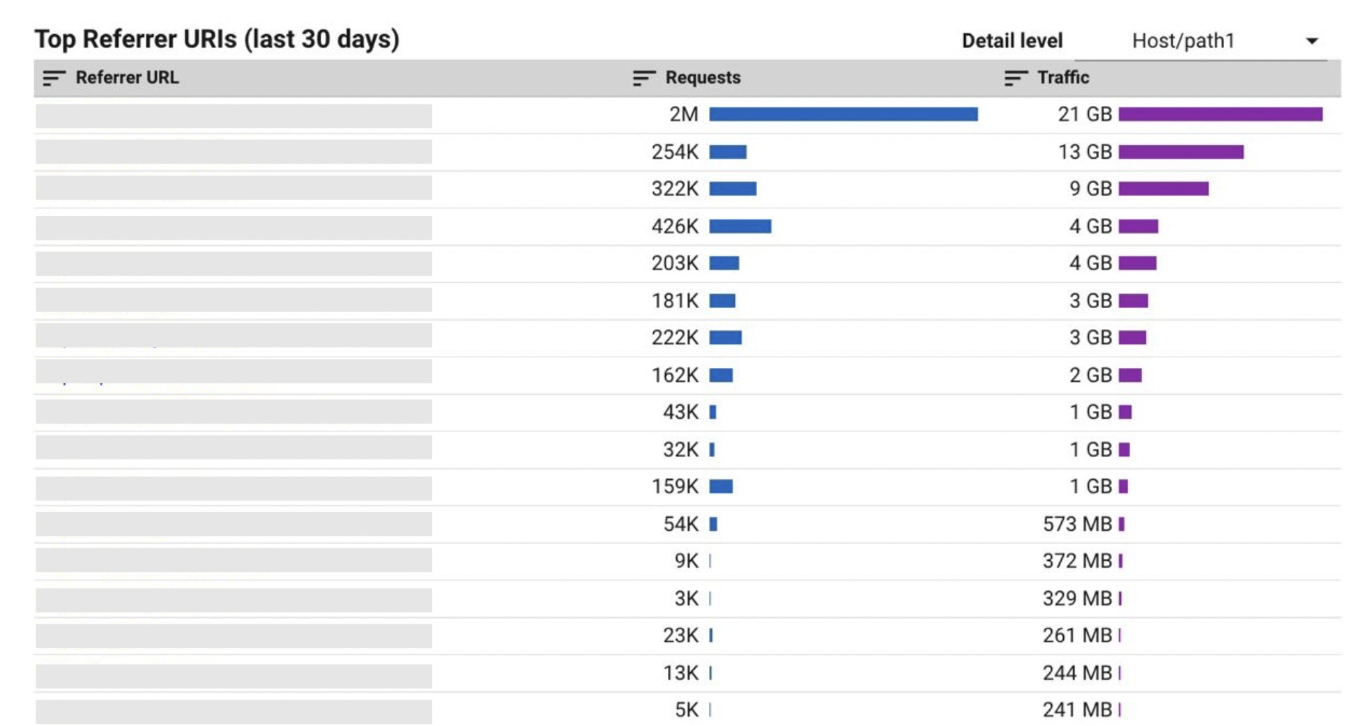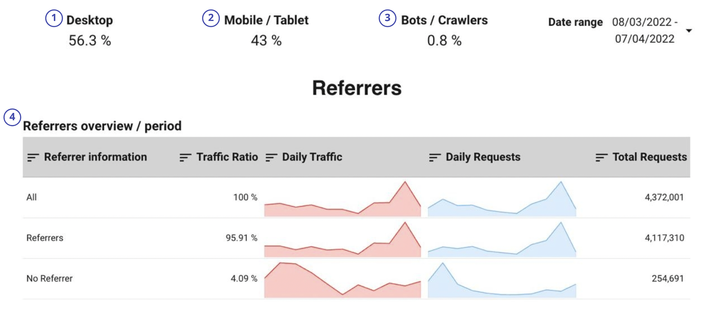 Delivery page shows a referrer overview and top traffic and requests related to referrers.