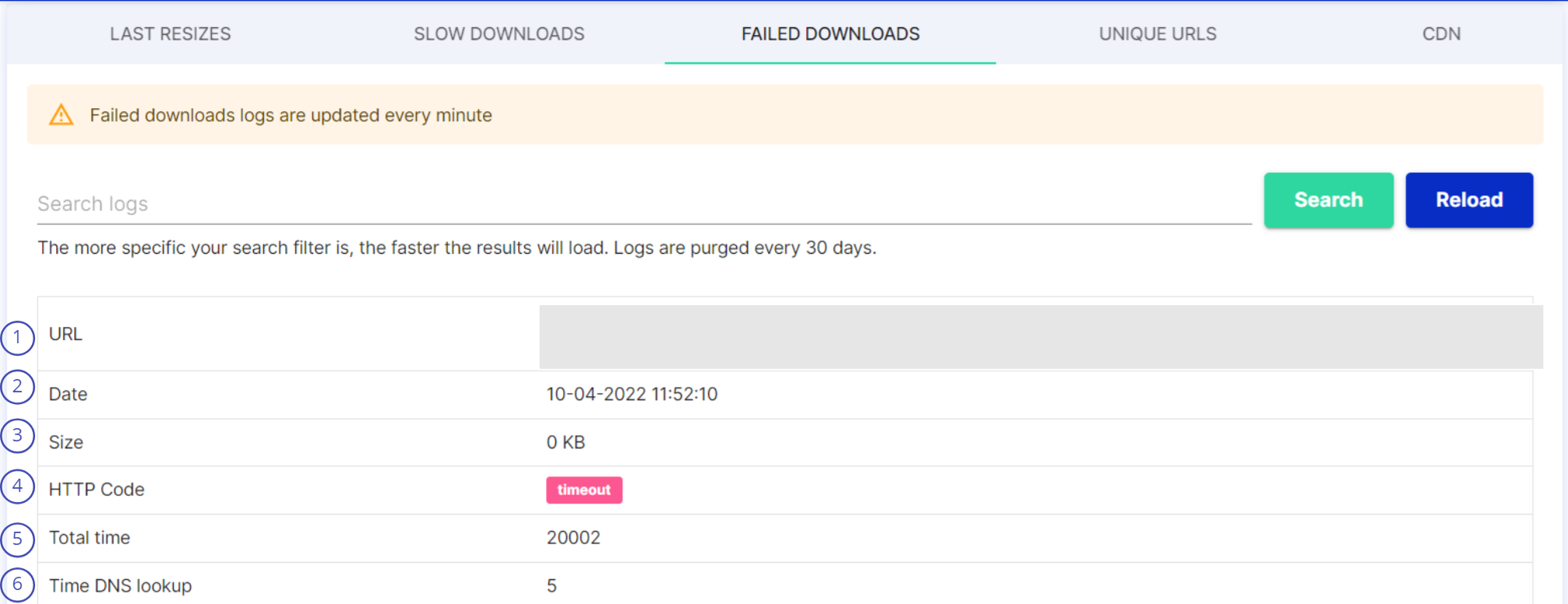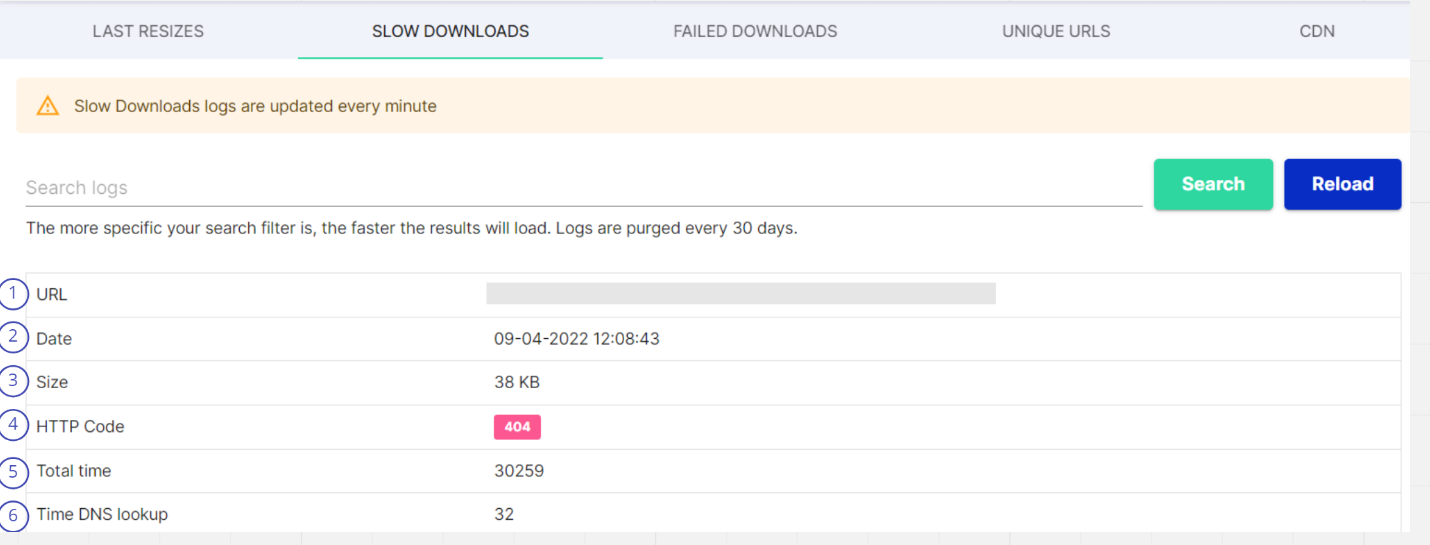 <table><thead><tr><th width="58.333333333333314">#</th><th>Item</th><th>Description</th></tr></thead><tbody><tr><td>1</td><td>URL</td><td>Path of the image</td></tr><tr><td>2</td><td>Date</td><td>Timestamp for the download process</td></tr><tr><td>3</td><td>Size</td><td>Size of Image</td></tr><tr><td>4</td><td>HTTP code</td><td>This is the HTTP code sent by Server, which will be forwarded to the user. It should mostly be 200 for successful images, 4xx and 5xx when we have a problem</td></tr><tr><td>5</td><td>Total Time</td><td>Total time to process the request for an image</td></tr><tr><td>6</td><td>Time DNS lookup</td><td>the time it takes a Domain Name Server to receive the request for a domain name’s IP address, process it, and return the IP address to the browser</td></tr></tbody></table>