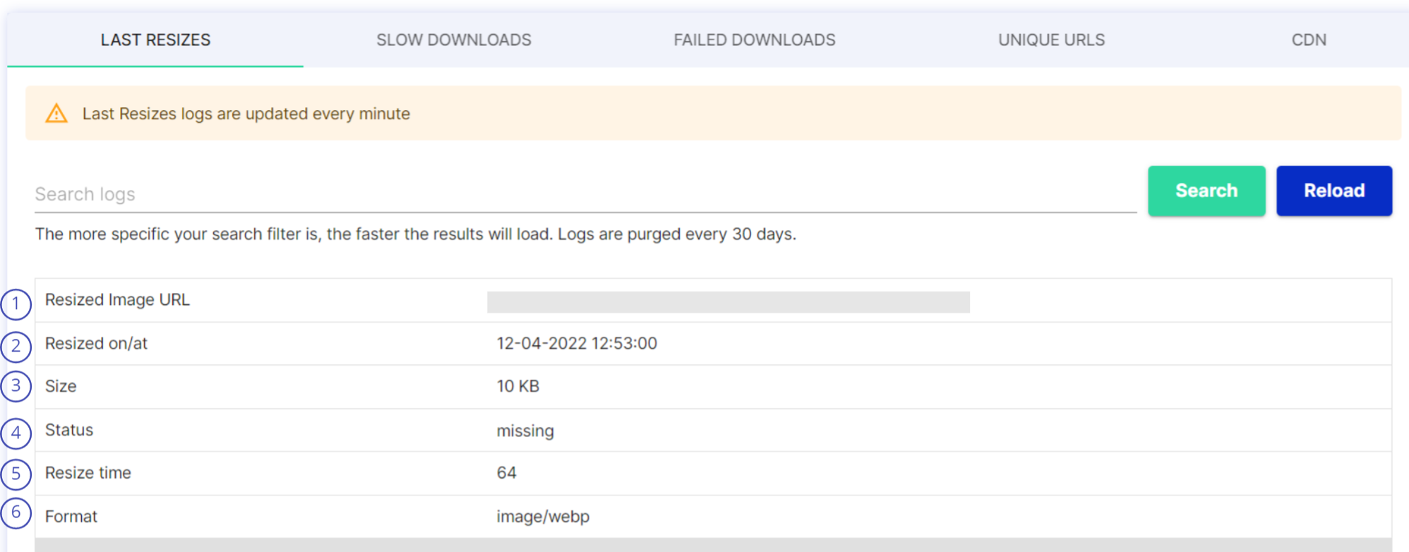 <table><thead><tr><th width="58.333333333333314">#</th><th>Item</th><th>Description</th></tr></thead><tbody><tr><td>1</td><td>Resized Image URL</td><td>Path of the image</td></tr><tr><td>2</td><td>Resized on/at</td><td>Timestamp of the resize process</td></tr><tr><td>3</td><td>Size</td><td>Size of image</td></tr><tr><td>4</td><td>Status</td><td>Status of an image in server</td></tr><tr><td>5</td><td>Resize time</td><td>Time taken to resize (Milliseconds)</td></tr><tr><td>6</td><td>Format</td><td>Image format</td></tr></tbody></table>