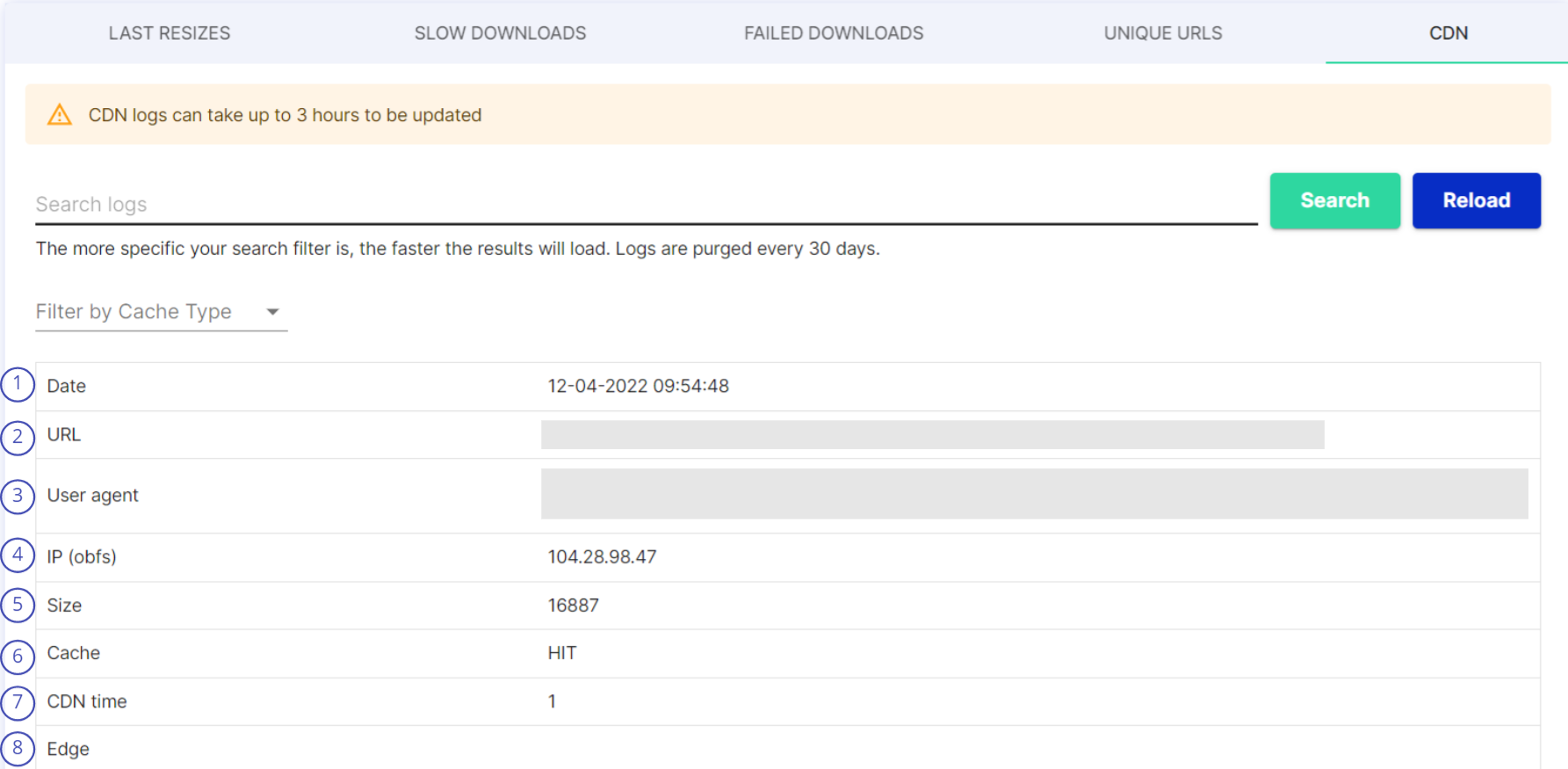 <table><thead><tr><th width="58">#</th><th>Item</th><th>Description</th></tr></thead><tbody><tr><td>1</td><td>Date</td><td>Timestamp for the process</td></tr><tr><td>2</td><td>URL</td><td>Not the full URL, only PATH of the file</td></tr><tr><td>3</td><td>User agent</td><td>User Agent (including OS/browser name) of the user which initially requested the image. This is information from the user, before the CDN</td></tr><tr><td>4</td><td>IP (obfs)</td><td>IP address of client</td></tr><tr><td>5</td><td>Size</td><td>Size of file</td></tr><tr><td>6</td><td>Cache</td><td>Cache type , It shows if the file exists in the CDN cache or not</td></tr><tr><td>7</td><td>CDN time</td><td>CDN response time</td></tr><tr><td>8</td><td>Edge</td><td>(empty, deprecated)</td></tr></tbody></table>