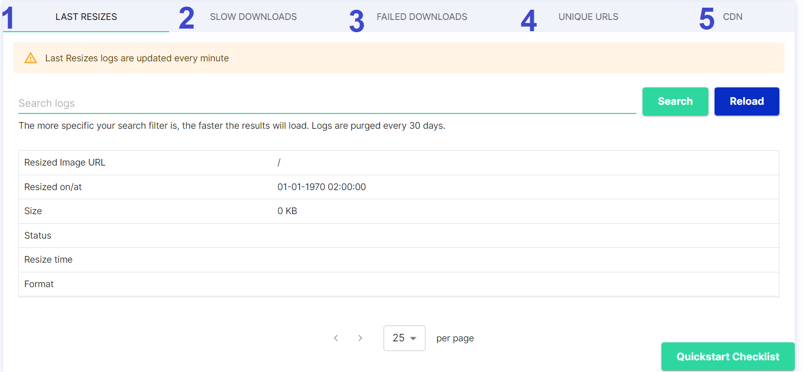 <table><thead><tr><th width="58.333333333333314">#</th><th>Menu item</th><th>Description</th></tr></thead><tbody><tr><td>1</td><td>LAST RESIZES</td><td>Gives a specific summary of the latest resizing processes</td></tr><tr><td>2</td><td>SLOW DOWNLOADS</td><td>Gives a specific summary of slow downloads processes</td></tr><tr><td>3</td><td>FAILED DOWNLOADS</td><td>Gives a specific summary of failed downloads (Timeout)</td></tr><tr><td>4</td><td>UNIQUE URLS</td><td>Unique URLs per token</td></tr><tr><td>5</td><td>CDN</td><td>Gives summary for each log in the CDN</td></tr></tbody></table>