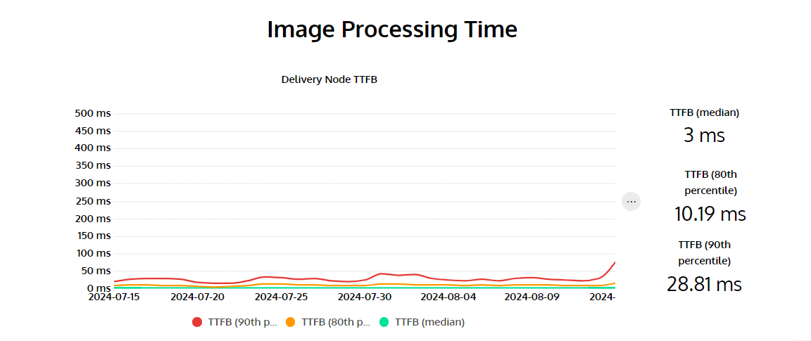 <table><thead><tr><th width="58">#</th><th>Title</th><th>Description</th></tr></thead><tbody><tr><td>1</td><td>Delivery Node TTFB</td><td>Time To First Byte (from moment request is received on Cloudimage infrastructure)</td></tr><tr><td>2</td><td>TTFB (median)</td><td>Median time to first byte (the responsiveness of a webserver)</td></tr><tr><td>3</td><td>TTFB (80th percentile)</td><td>80th percentile of time to first byte (the responsiveness of a webserver)</td></tr><tr><td>4</td><td>TTFB (90th percentile)</td><td>90th percentile of time to first byte (the responsiveness of a webserver)</td></tr></tbody></table>