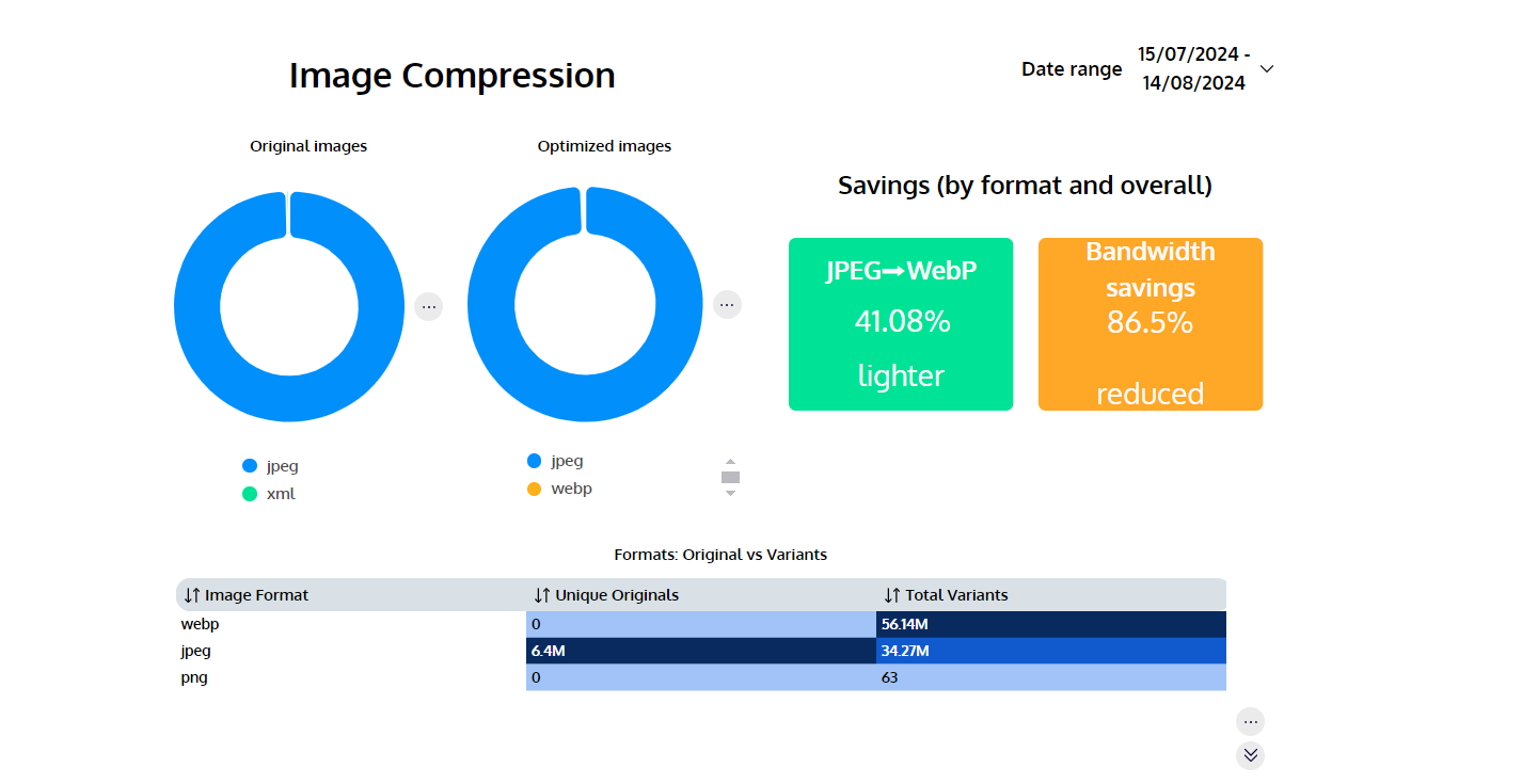 <table><thead><tr><th width="58">#</th><th>Title</th><th>Description</th></tr></thead><tbody><tr><td>1</td><td>Original Images</td><td>Percentages of original image types</td></tr><tr><td>2</td><td>Optimized Images</td><td>Percentages of optimized image types</td></tr><tr><td>3</td><td>Compression (JPEG --> WebP)</td><td>The percentage filesize difference of RESIZED images between WEBP and JPEG</td></tr><tr><td>4</td><td>Bandwidth savings</td><td>The percentage filesize difference between original and resized images</td></tr><tr><td>5</td><td>Formats: Original vs Variants</td><td>Number of original images and variants</td></tr></tbody></table>