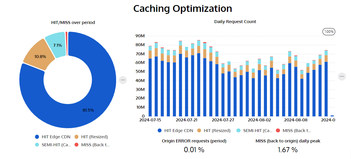 <table><thead><tr><th width="58">#</th><th>Title</th><th>Description</th></tr></thead><tbody><tr><td>1</td><td>HIT/MISS over period</td><td>The percentage of image status during selected period</td></tr><tr><td>2</td><td>Daily Request Count</td><td>Daily total requests per status</td></tr><tr><td>3</td><td>Origin Error requests (period)</td><td>Missing images or server errors when Cloudimage GET the Original</td></tr><tr><td>4</td><td>MISS (back to origin) daily peak</td><td>Missing both cache and transformed image on Cloudimage infrastructure</td></tr></tbody></table>