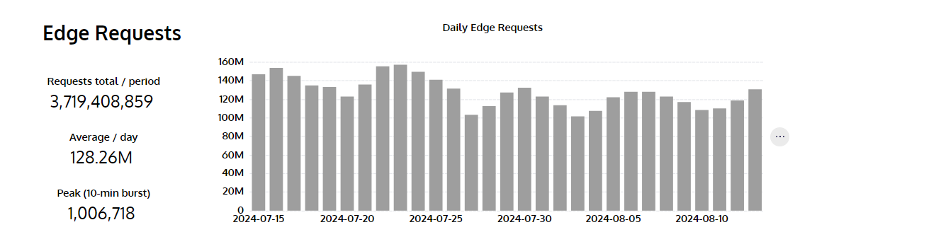 <table><thead><tr><th width="58">#</th><th>Title</th><th>Description</th></tr></thead><tbody><tr><td>1</td><td>Requests total / period</td><td>Total CDN requests that hit the CDN cache for the selected period.</td></tr><tr><td>2</td><td>Average / day</td><td>Average CDN requests per day during the selected period.</td></tr><tr><td>3</td><td>Peak(10-min burst)</td><td>Represents the maximum number of hit requests within 10 minutes during the selected period.</td></tr><tr><td>4</td><td>Daily Edge Requests</td><td>Daily total hit requests</td></tr></tbody></table>