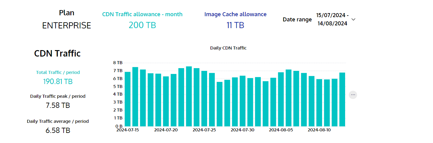 <table><thead><tr><th width="58">#</th><th>Title</th><th>Description</th></tr></thead><tbody><tr><td>1</td><td>Plan</td><td>Subscribed Plan</td></tr><tr><td>2</td><td>CDN Traffic allowance - month</td><td>Monthly allowed usage of CDN</td></tr><tr><td>3</td><td>Image Cache allowance - month</td><td>Monthly allowed usage of Image cache</td></tr><tr><td>4</td><td>Daily CDN traffic</td><td>Total CDN traffic per day</td></tr><tr><td>5</td><td>Total traffic / period</td><td>Sum of CDN traffic during selected period</td></tr><tr><td>6</td><td>Daily traffic peak / period</td><td>Max traffic during selected period</td></tr><tr><td>7</td><td>Daily traffic average / period</td><td>Average of CDN traffic during selected period</td></tr></tbody></table>