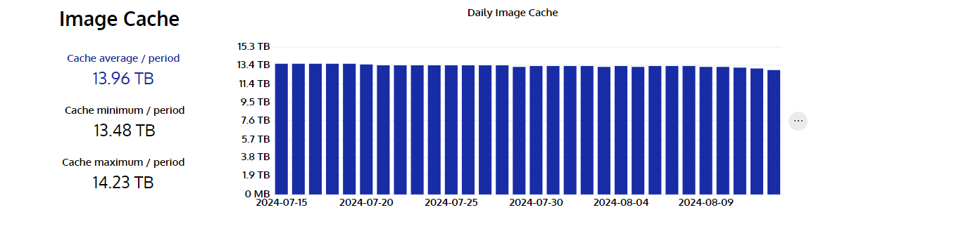 <table><thead><tr><th width="58">#</th><th>Title</th><th>Description</th></tr></thead><tbody><tr><td>1</td><td>Cache average / period</td><td>Average cached images within a selected period</td></tr><tr><td>2</td><td>Cache minimum / period</td><td>Minimum cached images within a selected period</td></tr><tr><td>3</td><td>Cache maximum / period</td><td>Maximum cached images within a selected period</td></tr><tr><td>4</td><td>Daily Image Cache</td><td>Daily total traffic of cached images</td></tr></tbody></table>