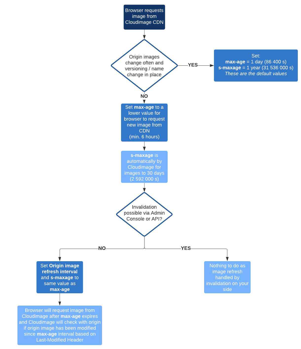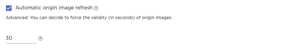 If you need to use a very small caching interval for a specific image (for example, snapshots from a live webcam or a specific chart with dynamically changing contents), you need to change the *Automatic origin image refresh* setting in your Admin console. This tells our resizing servers to update all origin images after this interval has expired.