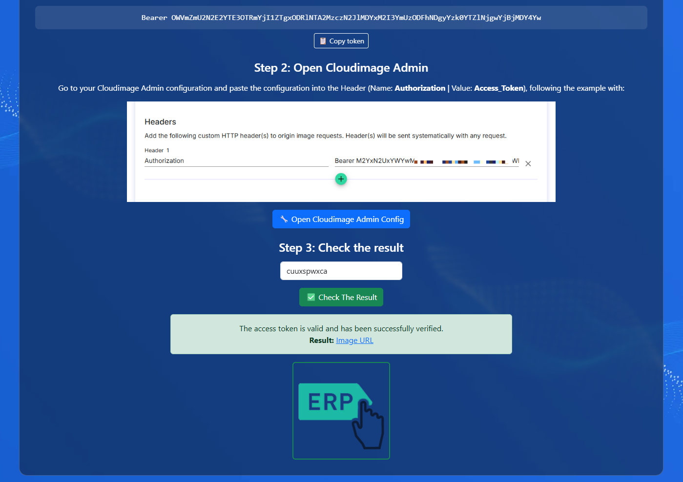 * **Step 3:** Go back to the "Scaleflex DMO Success Connected" browser tab, enter your Cloudimage Token, and click on the button **"Check The Result"**.