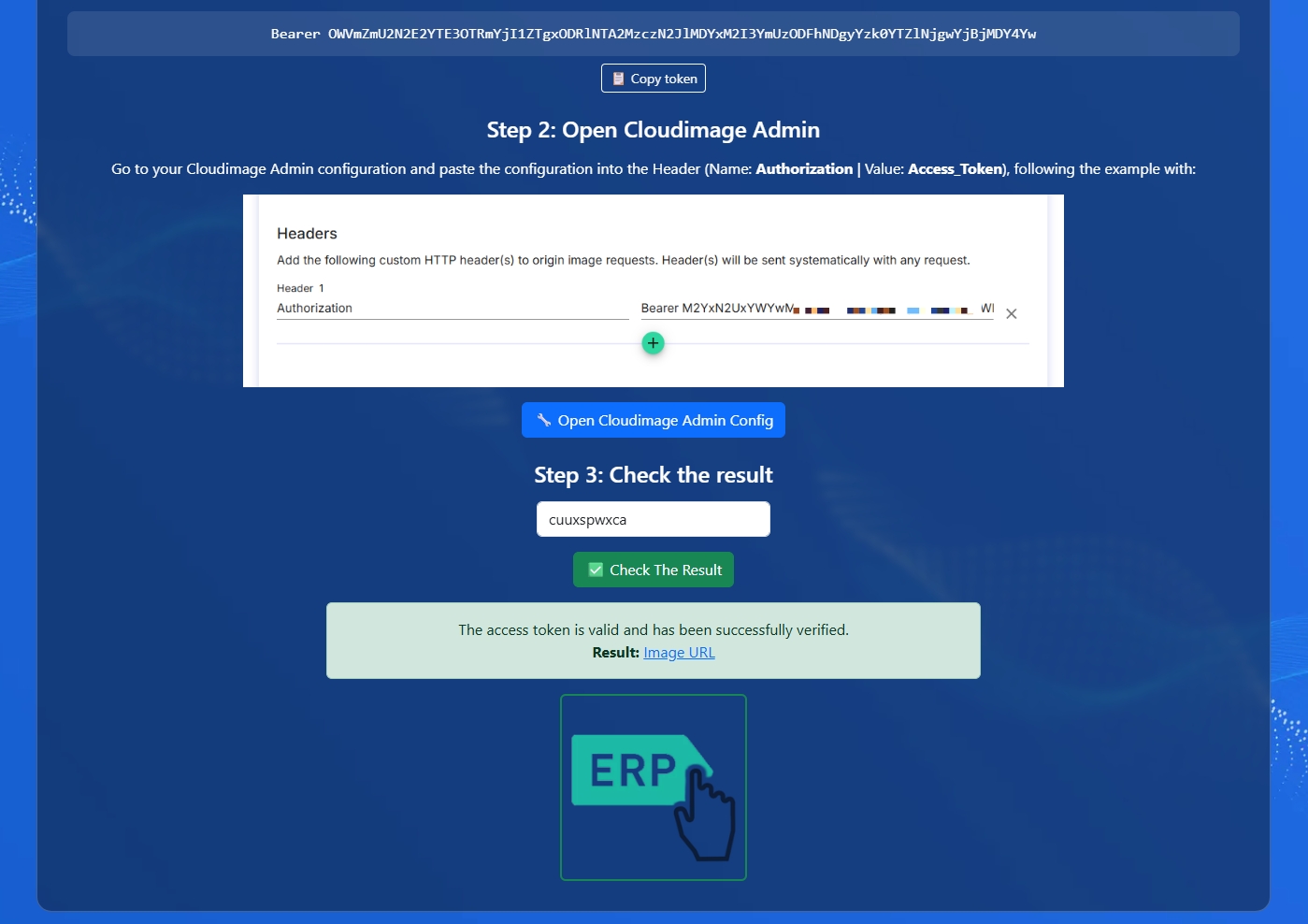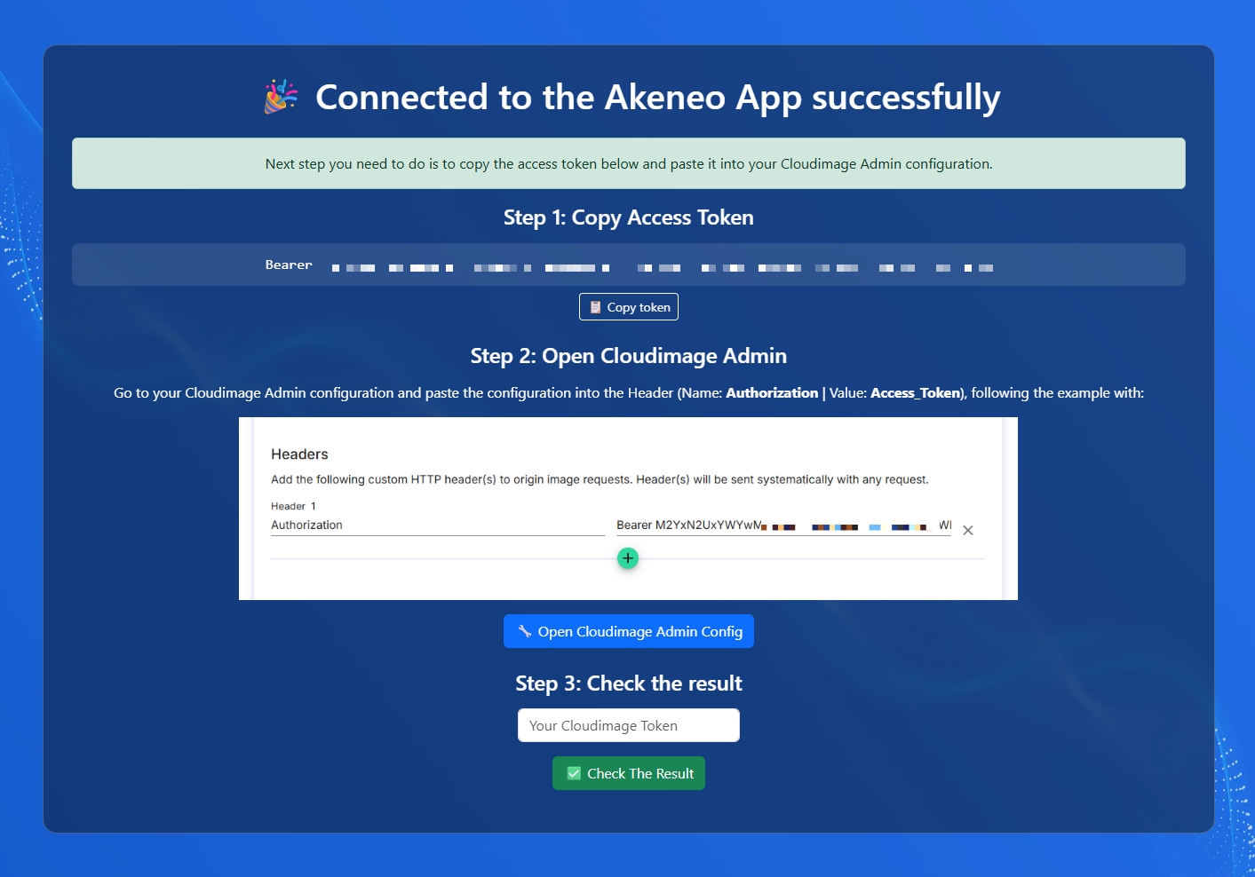 Step 3: Go back to the "Scaleflex DMO Success Connected" browser tab, enter your Cloudimage Token, and click on the button "Check The Result".