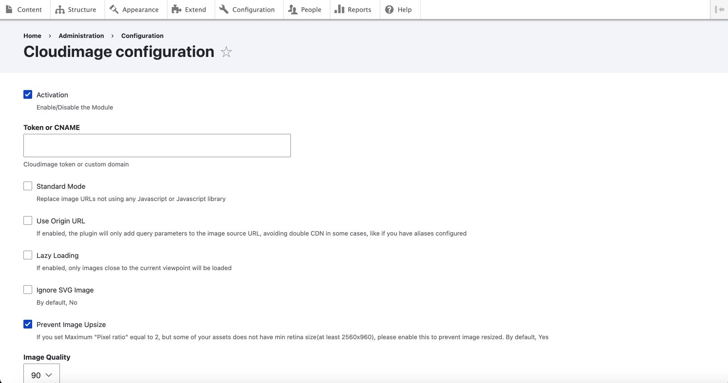 * **Token or CNAME**: Please enter your cloudimage token here (eg: abcdefgh), or your complete CNAME (eg. media.company.com) if the configuration is already validated in your Cloudimage Admin.