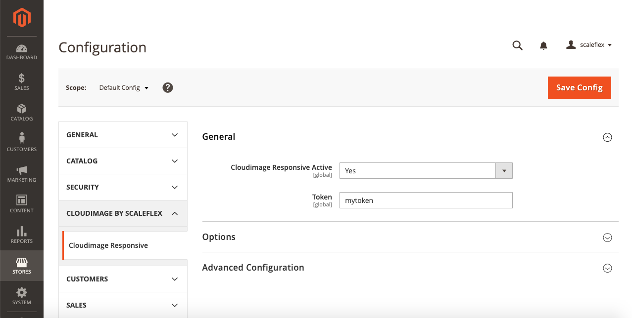 Activate the module and enter your Cloudimage token in the module configuration in Magento admin interface: `Stores / Configuration / Cloudimage by Scaleflex / Cloudimage Responsive`:
