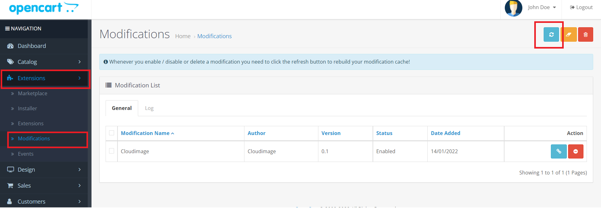Navigate to *Extensions*->*Modifications* and select *refresh* in the Modification panel. Refresh button will be available on the top right corner as shown below: