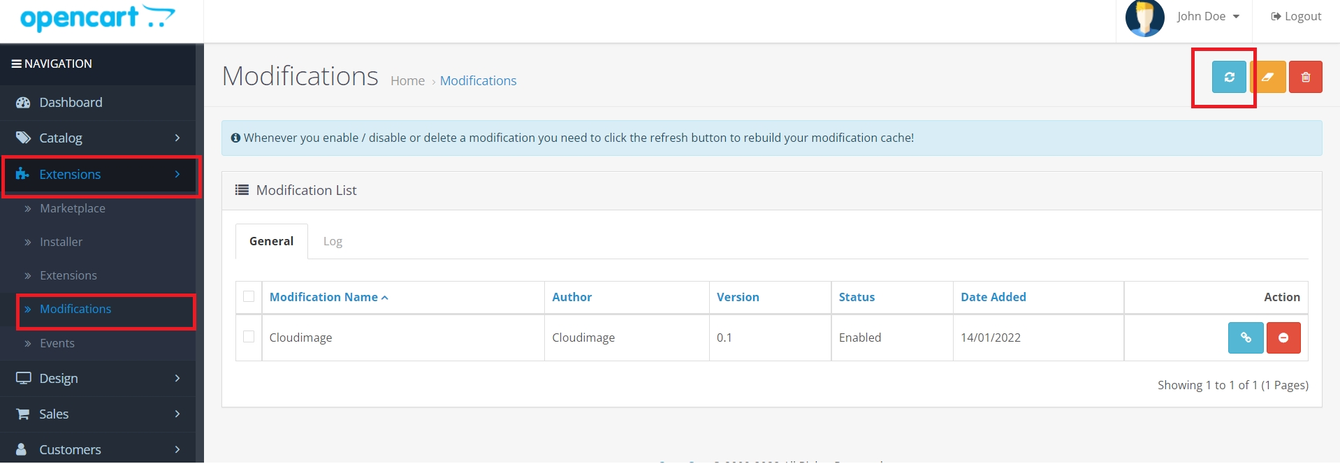 Navigate to Extensions->Modifications and select refresh in the Modification panel. Refresh button will be available on the top right corner as shown below: