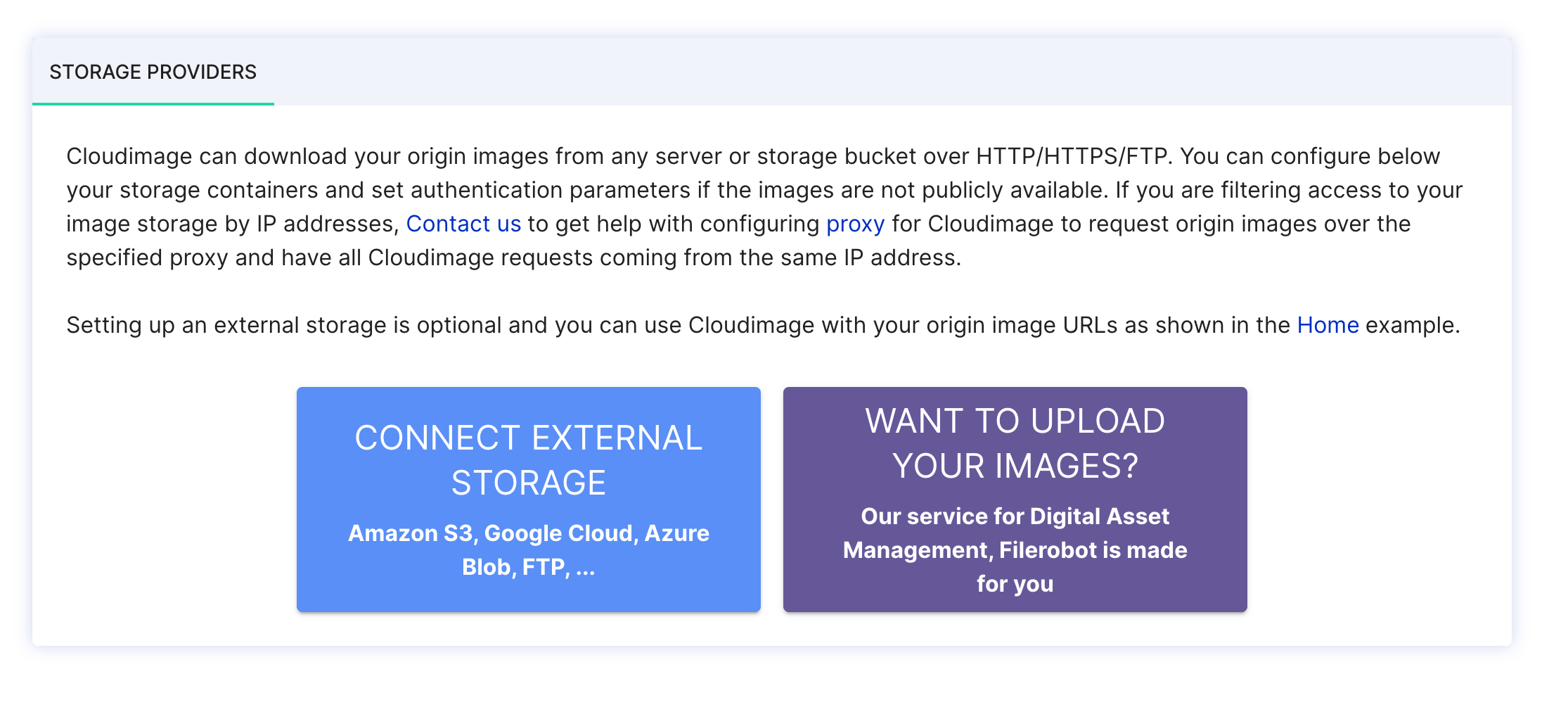 Cloudimage can download your origin images/files from any server or storage bucket over HTTP/HTTPS/FTP. Setting up an external storage is optional and you can use Cloudimage with your origin image URLs as shown in the introduction - [readme](https://docs.cloudimage.io/readme "mention").