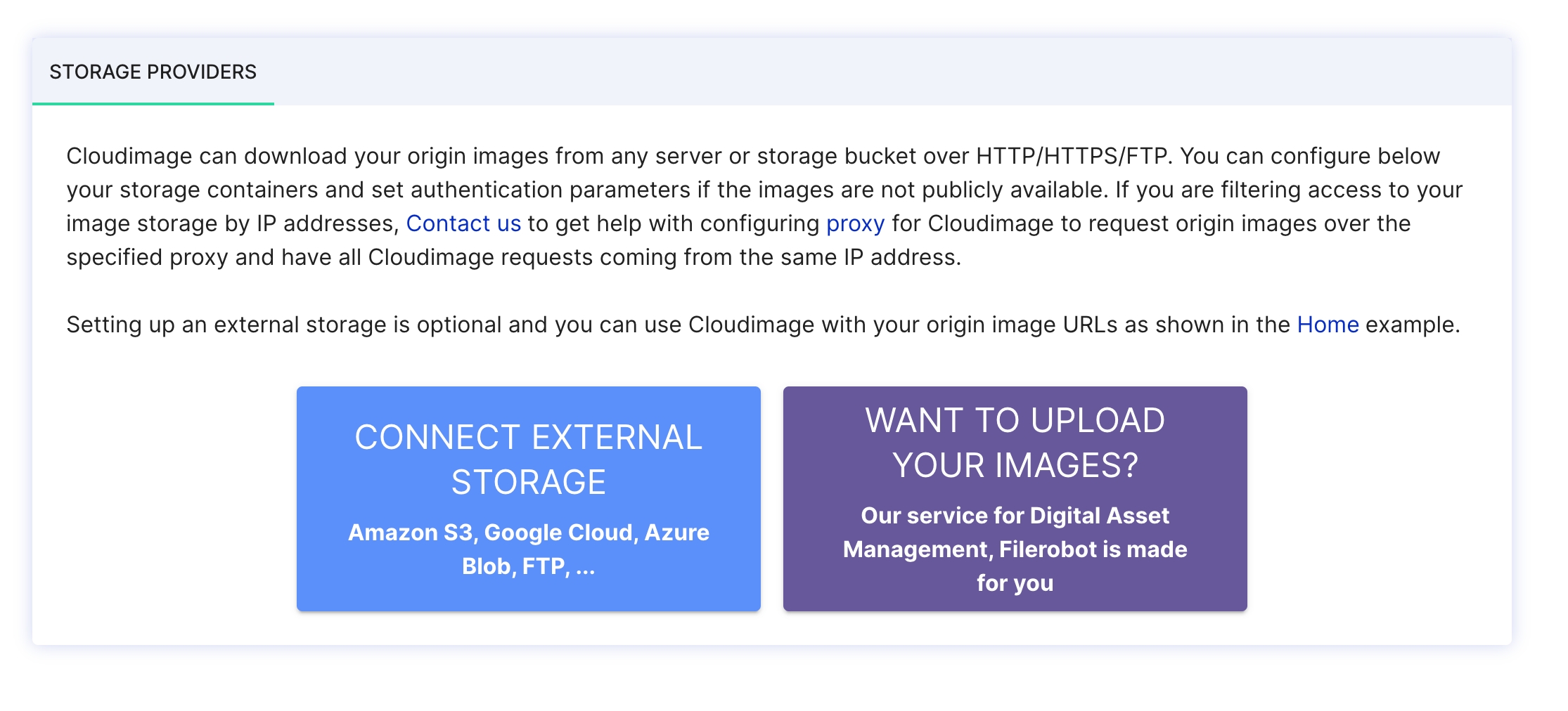 Cloudimage can download your origin images/files from any server or storage bucket over HTTP/HTTPS/FTP. Setting up an external storage is optional and you can use Cloudimage with your origin image URLs as shown in the introduction - Welcome to Cloudimage.