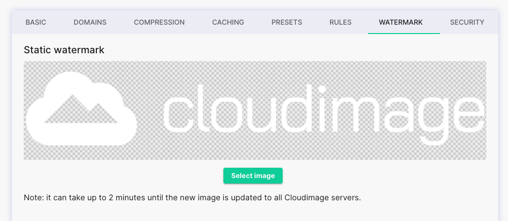 Log in to your Cloudimage admin console, navigate to *Image Settings / Watermark,* and upload your default watermark using the uploader.