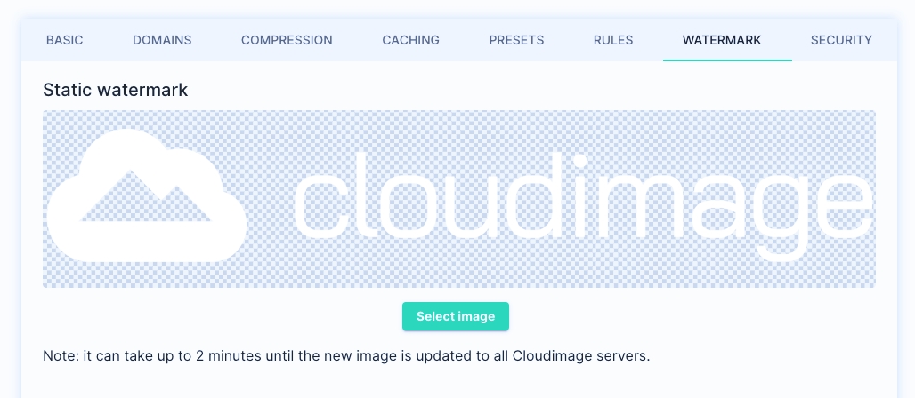 Log in to your Cloudimage admin console, navigate to Image Settings / Watermark, and upload your default watermark using the uploader.